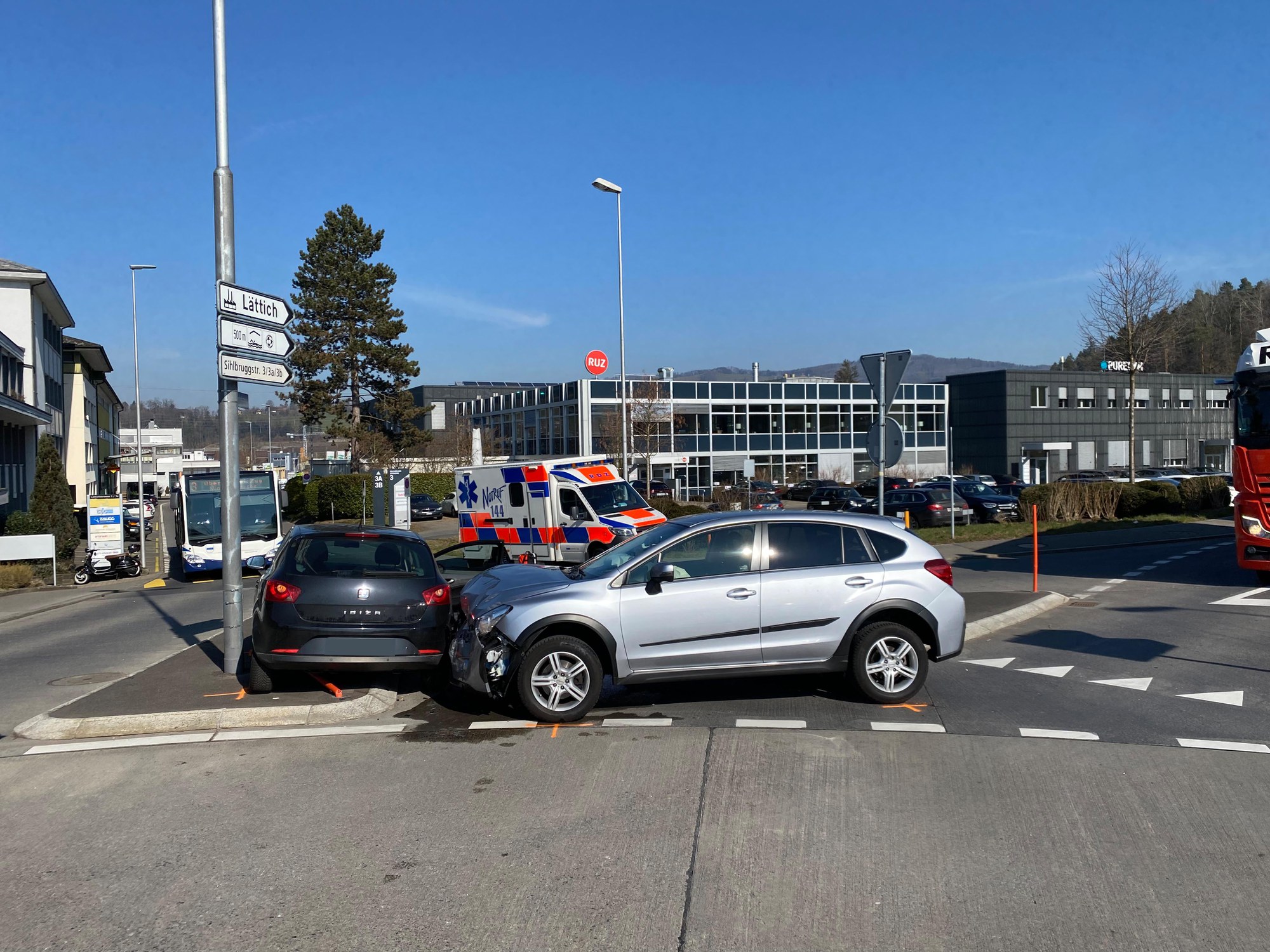 Der Unfall passierte am Donnerstag (3. März 2022), kurz vor 11:00 Uhr. Eine 80-jährige Autofahrerin fuhr von der Sihlbruggstrasse kommend in den Kreisverkehr ein und wollte in die Langgasse fahren. Dabei übersah sie eine 24-jährige Fahrzeuglenkerin, die sich bereits im Kreisverkehr befand. In der Folge kam es zu einer heftigen Kollision.