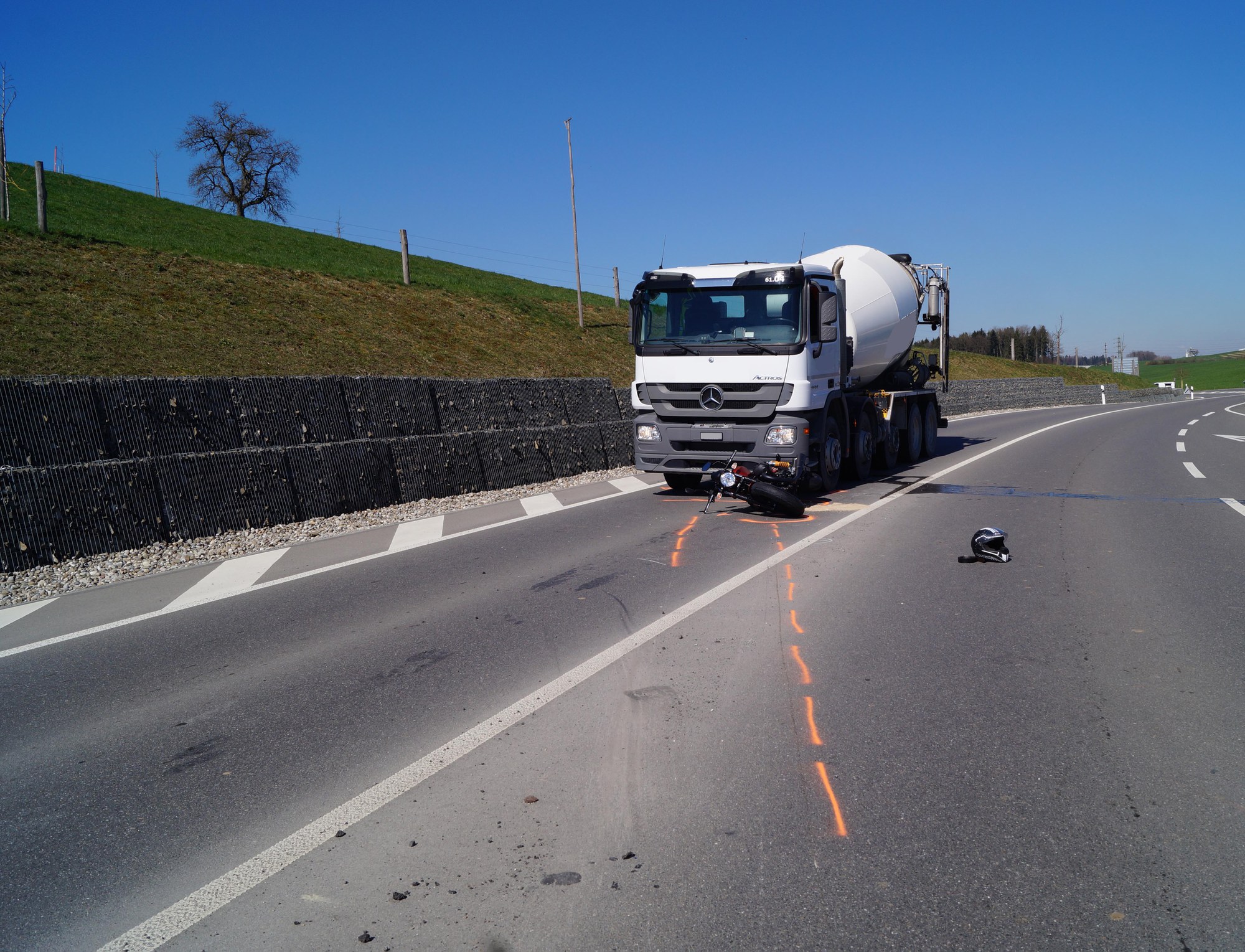 Der Unfall ereignete sich am Mittwochmorgen (20. März 2019), kurz vor 10:30 Uhr, auf der Kantonsstrasse H, zwischen dem Kreisel Grindel und Bibersee. Ein 51-jähriger Motorradfahrer kam in einer leichten Kurve zu Fall und rutschte in der Folge in einen entgegenkommenden Lastwagen. Dabei verletzte sich der Zweiradlenker erheblich. Nach der medizinischen Erstversorgung wurde er mit dem Rettungshelikopter der Alpine Air Ambulance ins Spital eingeliefert.