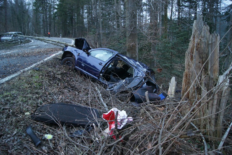 Drei Personen wurden wegen übersetzter Geschwindigkeit bei einem Selbstunfall verletzt. Ihr Auto war gegen zwei Bäume geprallt.