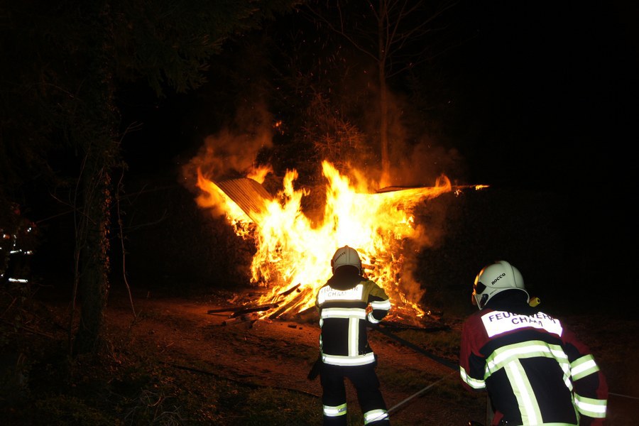 Eine Zuger Polizistin befand sich kurz vor 00:20 Uhr auf Patrouille in Cham, als sie bei der Ziegelhütte im Gebiet Chellenmatt lodernde Flammen bemerkte. Ein Holzstoss stand in Vollbrand. Die alarmierte Feuerwehr Cham konnte das Feuer nach einiger Zeit löschen. Verletzt wurde niemand.