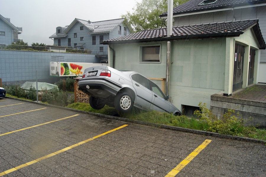 Die beiden Fahrzeuginsassen blieben unverletzt. Das Auto erlitt kleinere Schäden an der Front und am Unterboden. Ebenfalls wurde ein Kaminrohr des Gebäudes in Mitleidenschaft gezogen.