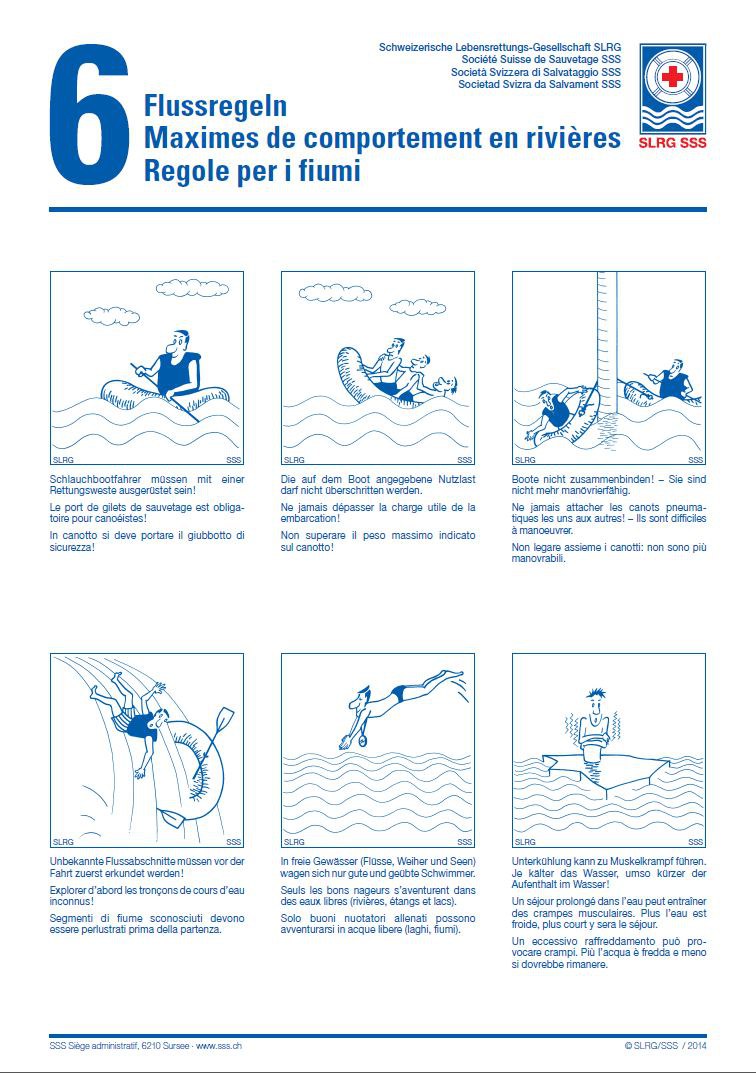 Zu den Kernbotschaften zählen neben den jeweils spezifischen Gefahren vor Ort, die sechs Flussregeln der Schweizerischen Lebensrettungs-Gesellschaft (SLRG):