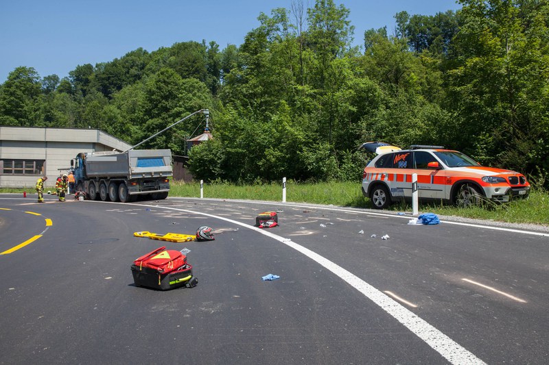 Am Dienstagmittag (20. Juni 2017), kurz nach 12 Uhr, ist ein Motorradfahrer auf der Sihlbruggstrasse in der Laubaukurve gestürzt, worauf er auf die Gegenfahrbahn geriet. Dort prallte der 61-Jährige in einen korrekt entgegenkommenden Lastwagen. Sein Roller wurde vom Lastwagen überrollt, er selber wurde weggeschleudert und schwer verletzt. Der Rettungsdienst Zug betreute den Verunfallten vor Ort, bis er mit dem Rettungshelikopter ins Spital geflogen wurde.