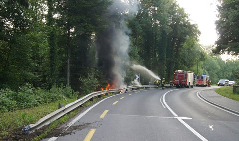 124 / Baar: Auto kommt von Strasse ab und fängt Feuer