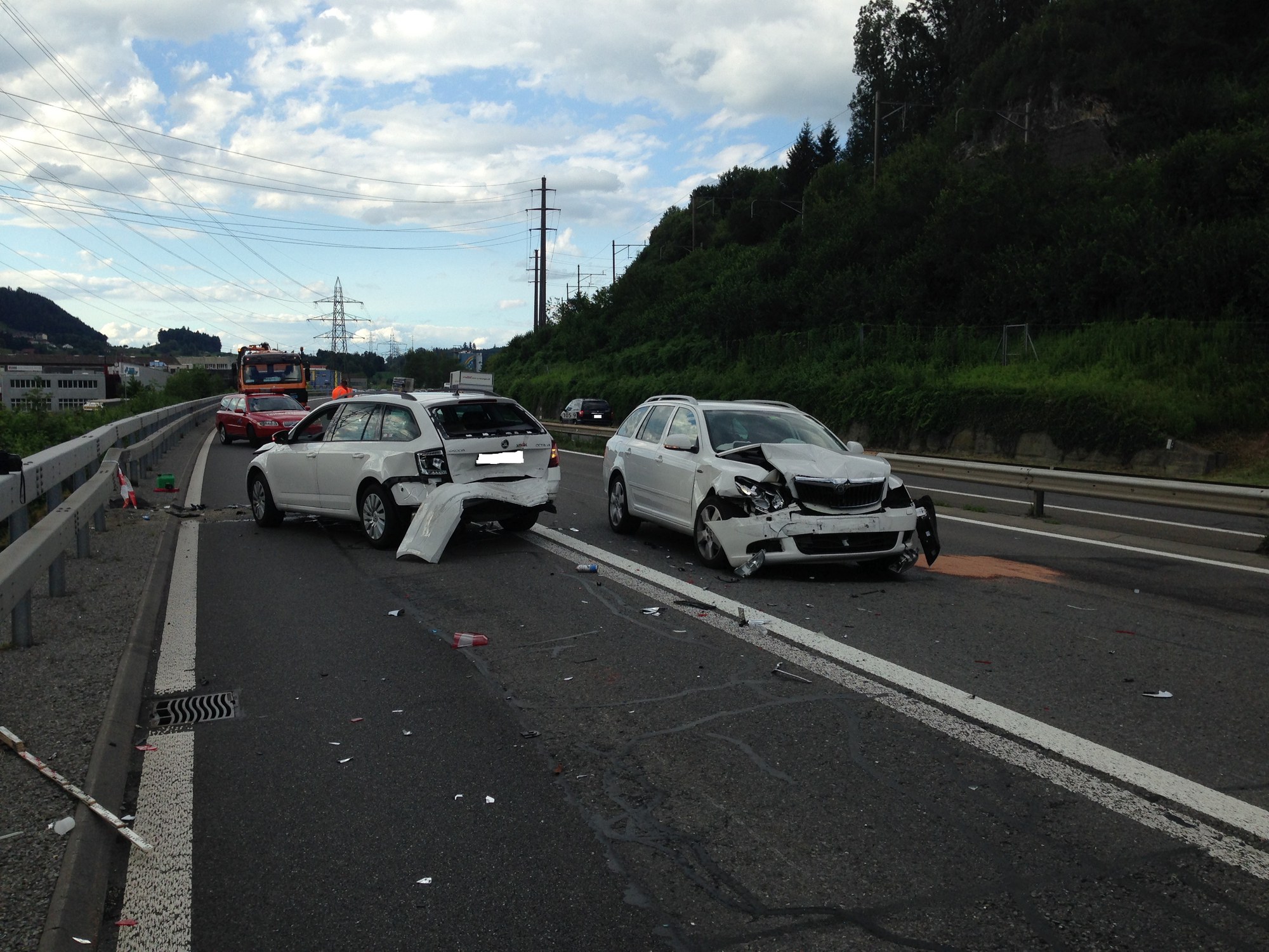 Nur wenige Minuten nach dem ersten Auffahrunfall ereignete sich ein zweiter. Hier waren drei Autos beteiligt. Zwei Männer wurden leicht verletzt. Sie wurden vom Rettungsdienst betreut und ins Spital gebracht. Zwei Autos erlitten beim Unfall Totalschaden. Der Sachschaden an den drei Autos und an der Leichteinrichtung beläuft sich auf rund 60'000 Franken.