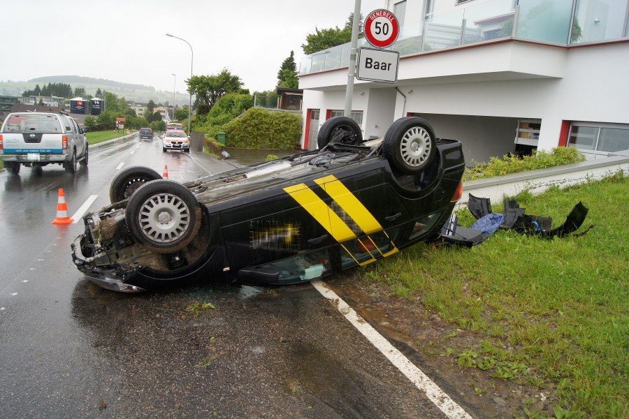 Nach einem Fahrfehler ist am Dienstagmorgen (12. Juni 2012) ein Auto auf dem Dach gelandet. Der Selbstunfall ereignete sich kurz vor 09:00 Uhr, als ein 31-jähriger Automobilist talwärts auf der Ägeristrasse in Richtung Baar fuhr. In Gedanken versunken geriet er während der Fahrt auf die Gegenfahrbahn. Als der Lenker den Fahrfehler realisierte, riss er abrupt das Steuer nach rechts. Zu viel für den Personenwagen. Das Auto überschlug sich und blieb auf dem Dach liegen.