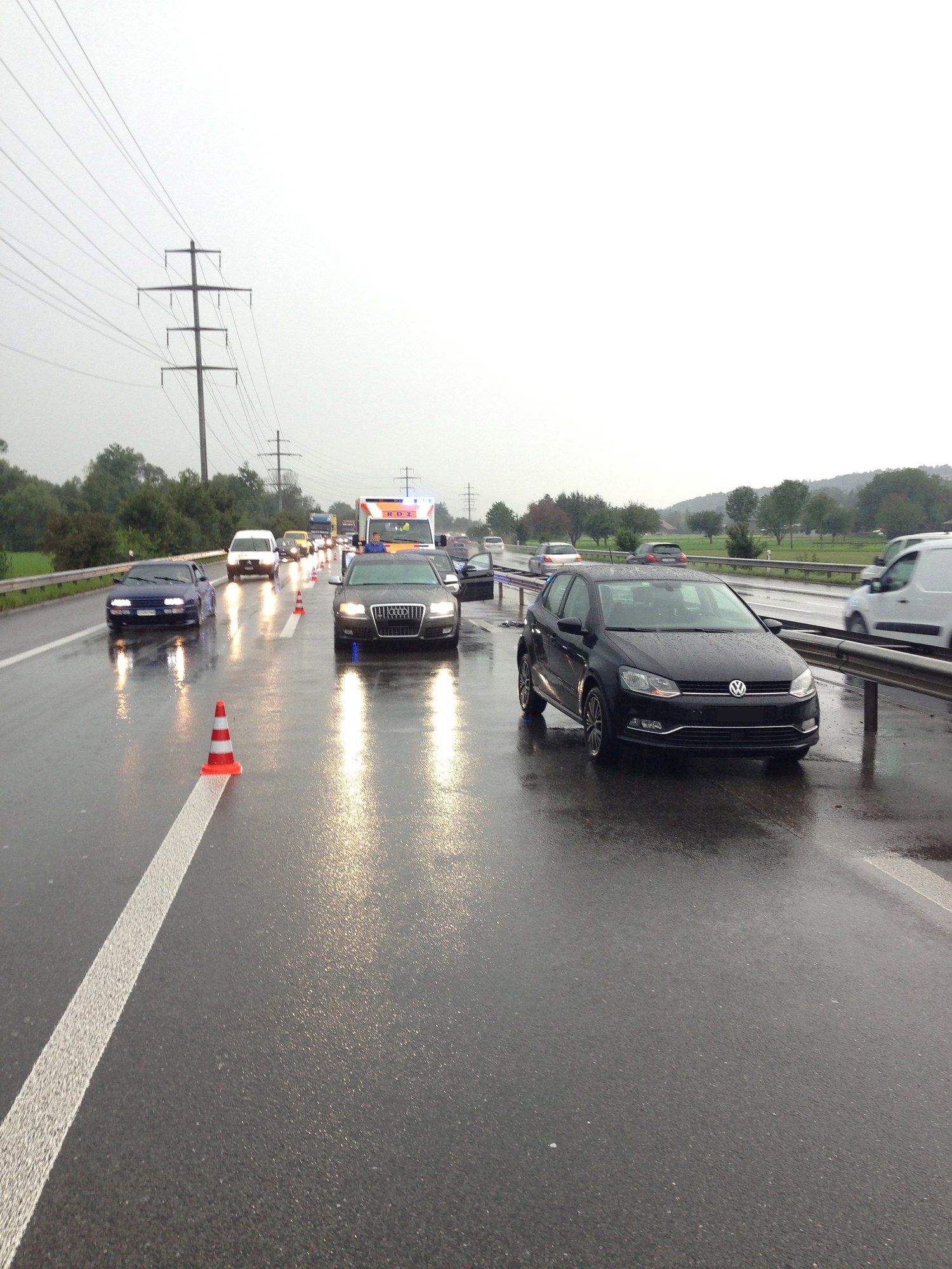 Wegen dem starken Regen und sehr viel Wasser auf der Fahrbahn musste die Autobahn A4a im Feierabendverkehr gesperrt werden. Fast zeitgleich ereignete sich auf der Autobahn A14 ein Auffahrunfall mit drei beteiligten Fahrzeugen.