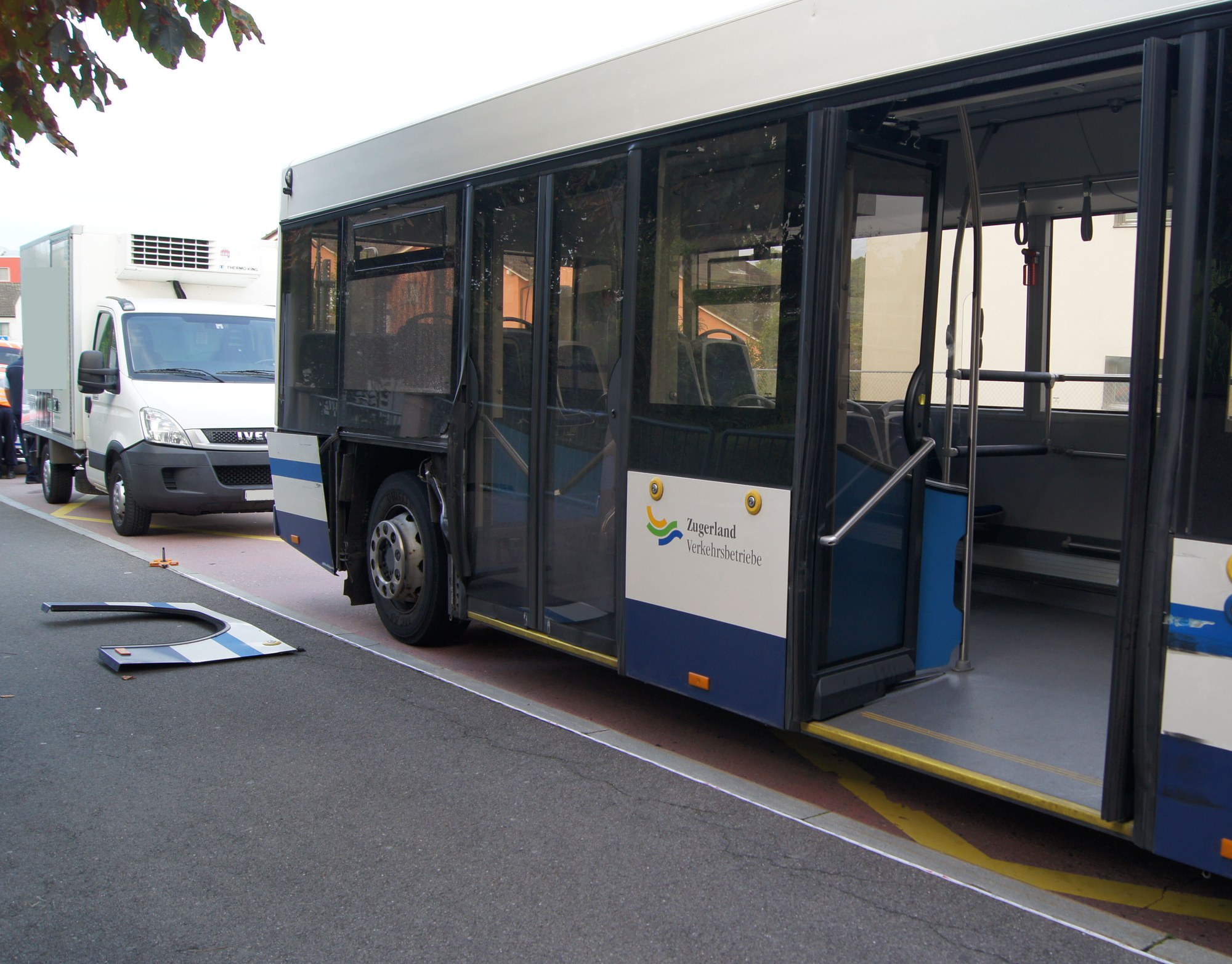 Beim Kolinplatz hat ein Lieferwagen einen Linienbus der Zugerland Verkehrsbetriebe übersehen. Bei der Kollision wurde niemand verletzt, der Sachschaden ist beträchtlich.