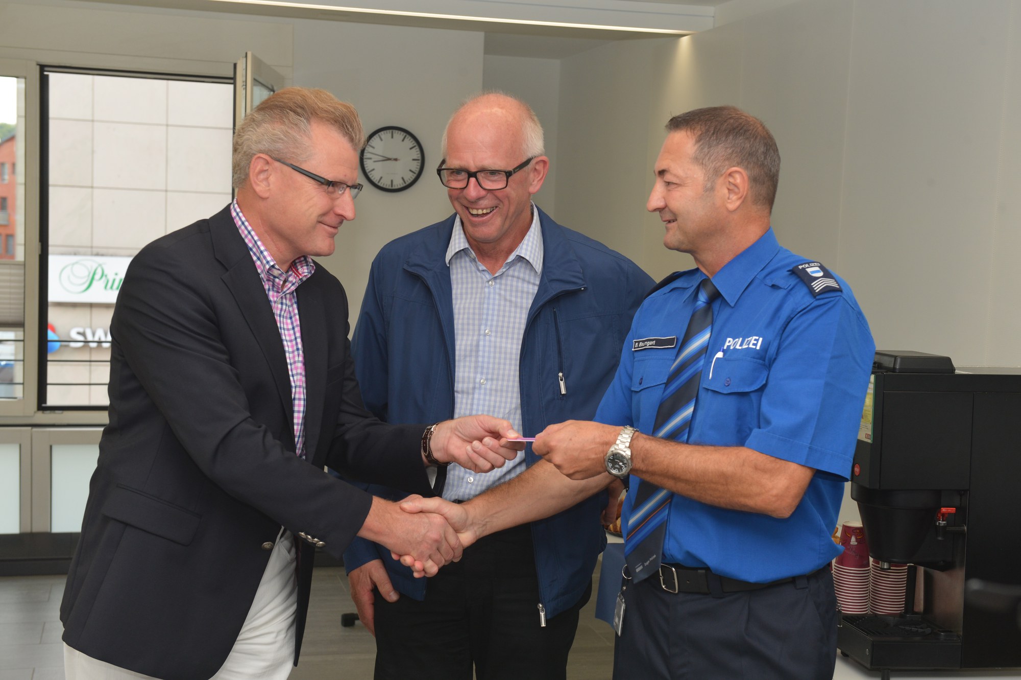 Am frühen Samstagmorgen durfte Beat Baumgart, Chef der Polizeiregion Ennetsee, von Regierungsrat und Baudirektor Heinz Tännler den Schlüssel zur neuen Polizeidienststelle Cham entgegennehmen. "Ein Gebäude ist immer ein Kompromiss aus Sicherheit, Funktionalität und Wirtschaftlichkeit. Ich danke den Mitarbeitenden der Baudirektion des Kantons Zug für Ihr grosses Engagement. Es ist ihnen gelungen, das Beste aus diesem Kompromiss zu machen. Die Büros sind freundlich und hell und wir haben jetzt auch genügend Platz", freut sich Baumgart. Regierungsrat Heinz Tännler sagte in seiner Rede: "Der Umzug in die neuen Räumlichkeiten hat sich ganz offensichtlich gelohnt. Die Lösung ist in jeder Hinsicht zweckmässig und zudem noch wesentlich günstiger als der ursprünglich geplante Ausbau im Gemeindehaus. Kurz: Ein Gewinn für alle." Anlässlich des offiziellen Medienanlasses lobte der Chamer Gemeindepräsident, Bruno Werder, die gute Zusammenarbeit mit der Zuger Polizei: „Für ihren Einsatz gebührt den Polizistinnen und Polizisten grosser Dank. Für Cham ist und bleibt eine eigene Polizeidienststelle wichtig. Das Sicherheitsempfinden der Bevölkerung ist ein wesentlicher Faktor für die Lebensqualität. Und mit dem neuen Standort bleibt die für Cham wichtige Polizeiarbeit im Zentrum erhalten."