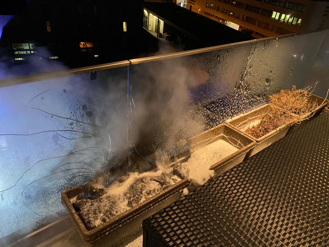 Auf einer Terrasse ist eine Blumenkiste in Brand geraten. Eine Polizeipatrouille entdeckte das Feuer und konnte dieses mit einem Feuerlöscher löschen.