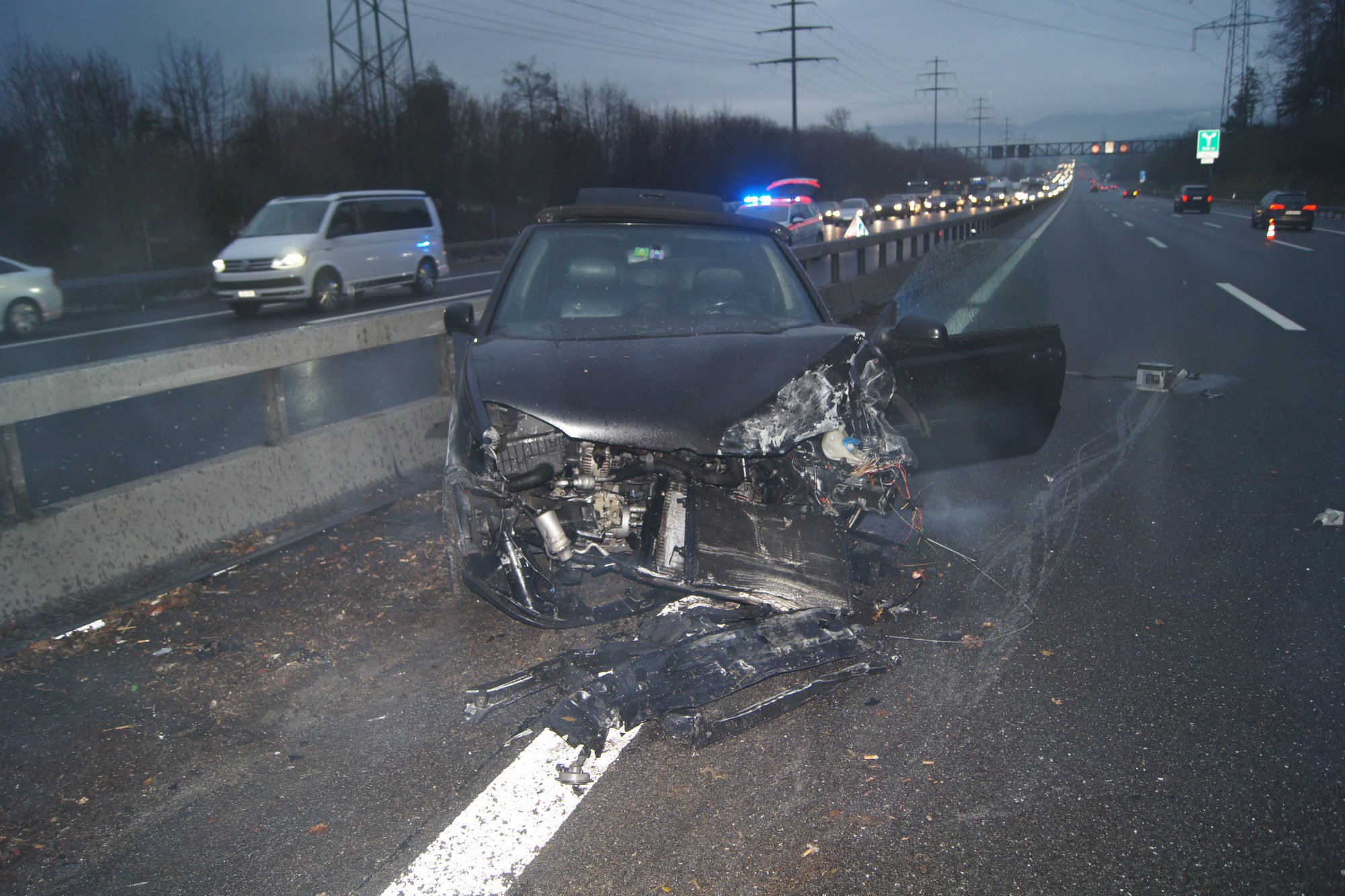 Während der Bergung, der Fahrbahnreinigung und der Instandstellung der massiv beschädigten Leiteinrichtung musste der Verkehr in beiden Richtungen einspurig an der Unfallstelle vorbeigeführt werden. Dies führte zu einem längeren Rückstau im Feierabendverkehr.