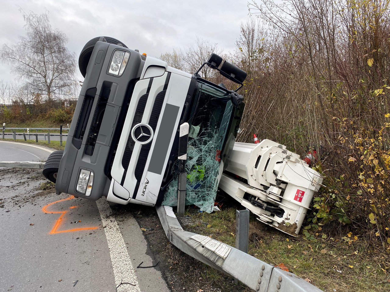 Nachdem ein Kranlastwagen in der Autobahneinfahrt verunfallt ist, musste diese gesperrt werden. Der Chauffeur blieb unverletzt, der Sachschaden ist beträchtlich.