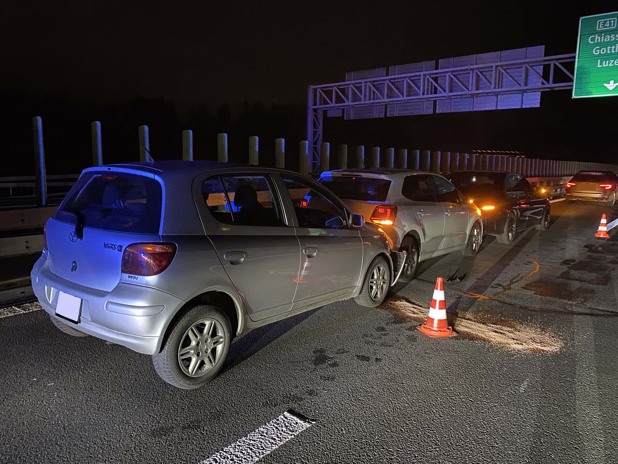 Eine halbe Stunde später um 18:00 Uhr prallten auf der A14 unmittelbar vor der Verzweigung Blegi, Fahrtrichtung Rotkreuz, drei Autos auf dem Überholstreifen ineinander. Auch in diesem Fall hatte eine 81-jährige Lenkerin zu wenig Abstand und konnte im stockenden Kolonnenverkehr nicht mehr rechtzeitig bremsen. Sie fuhr in das vor ihr fahrende Auto, das durch den Aufprall in ein weiteres Auto geschoben wurde. Das Auto der Unfallverursacherin wurde abgeschleppt. Der Sachschaden an den drei Fahrzeugen beträgt rund 10'000 Franken.