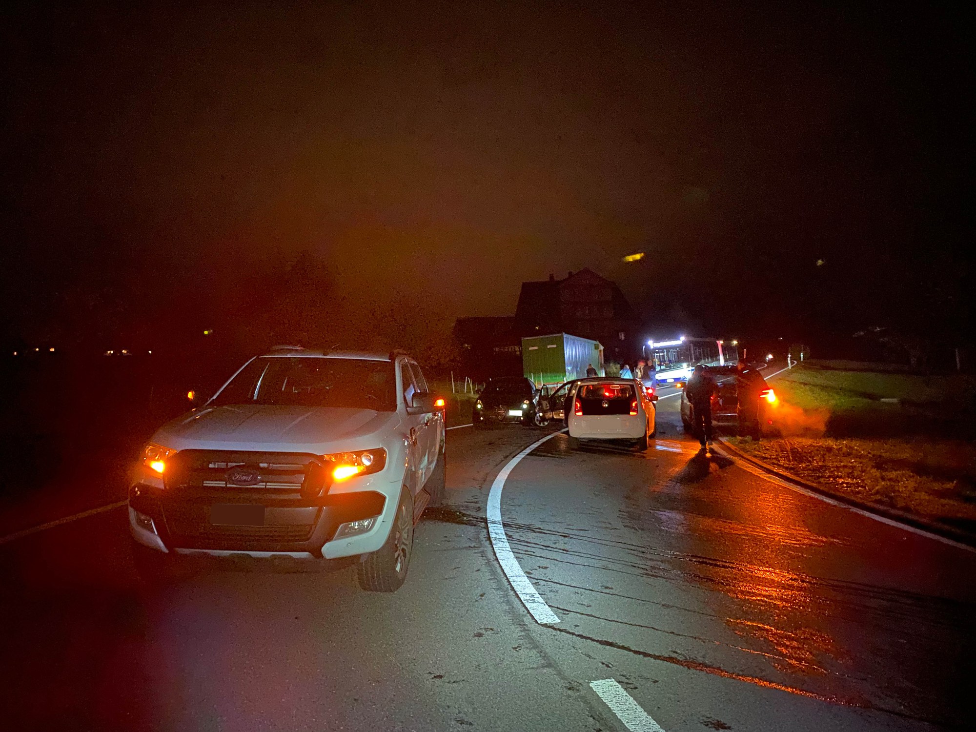 Der Unfall ereignete sich am Samstagabend (3. Dezember 2022), kurz vor 17:45 Uhr. Ein 82-jähriger Autofahrer fuhr auf der Allenwindenstrasse bergwärts, als er in einer Kurve auf die Gegenfahrbahn geriet. In der Folge kam es zuerst zu einer Streifkollision mit einem talwärts fahrenden Fahrzeug und anschliessend zu einer seitlich/frontalen Kollision mit einem weiteren, ebenfalls talwärts fahrenden Auto. Ein nachfolgender 25-jähriger Fahrzeuglenker, der bergwärts unterwegs war, konnte nicht mehr rechtzeitig bremsen und prallte in das Heck des Unfallverursachers.