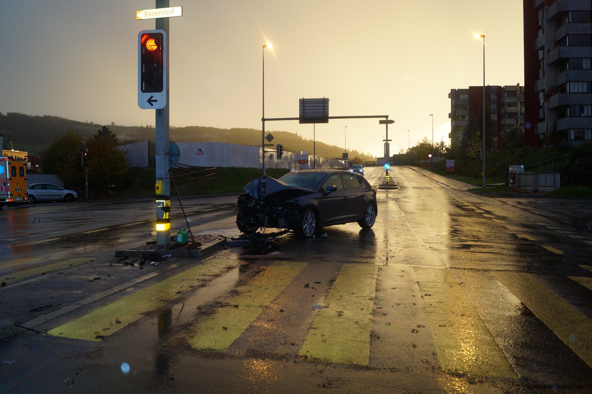 Weil aus dem Unfallauto Öl ausgelaufen war, standen auch Mitarbeitende des Strassenunterhaltsdienstes für die Reinigung der Fahrbahn im Einsatz, ebenso Mitarbeitende eines privaten Abschleppunternehmens für den Abtransport des beschädigten Fahrzeugs.