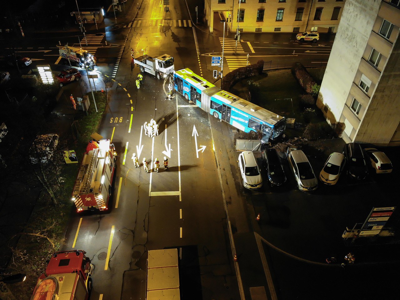 In der Nacht auf Dienstag (22. Dezember 2020), kurz nach Mitternacht, beabsichtigte ein 50-jähriger Autolenker von der Göblistrasse kommend über die Kreuzung in die Feldstrasse zu fahren. Gleichzeitig fuhr ein Linienbus der Zugerland Verkehrsbetriebe auf der vortrittsberechtigten Baarerstrasse von Zug kommend in Richtung Baar. In der Folge kam es zu einer heftigen Kollision zwischen den beiden Fahrzeugen. Dadurch geriet der Gelenkbus nach links, überquerte die Gegenfahrbahn, durchbrach eine Hecke und prallte schliesslich in vier parkierte Autos.