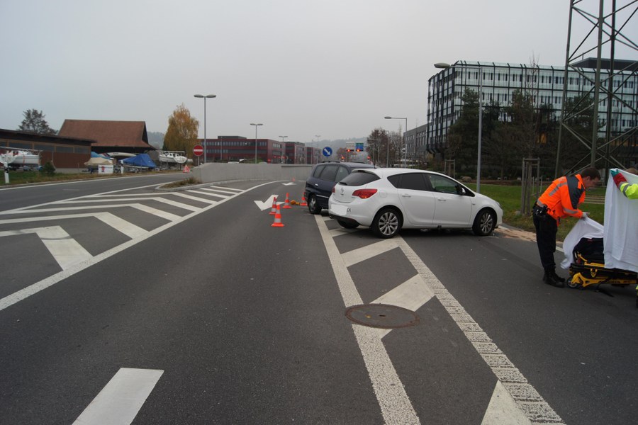 Am Samstagmorgen (12. November 2012) kurz vor 07:30 Uhr, befuhr eine 26-jährige Frau, in Begleitung ihrer Mutter, die Weststrasse in Richtung Zug. Eigentlich wollte sie in die Schochenmühlestrasse einbiegen. Diese Einfahrt verpasste sie jedoch und vollführte unmittelbar bei der Zusammenführung der Westrasse und der Nordzufahrt ein abruptes Wendemanöver (U-Turn). Dabei überfuhr sie zwei Sicherheitslinien und eine Sperrfläche und schnitt einem korrekt aus der Unterführung kommenden Autolenker den Weg ab. Durch die seitlich/frontale Kollision verletzte sich die Mutter der Autolenkerin mittelschwer und musste in Spitalpflege gebracht werden. Der 20-jährige Autolenker konnte durch den Rettungsdienst ambulant betreut werden.
