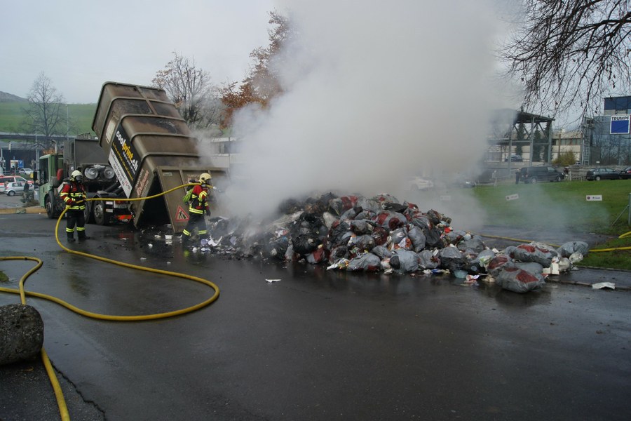 Ein Container eines Lastwagens der Kehrrichtabfuhr hat am Montag (14. November 2011) Feuer gefangen. Verletzt wurde niemand, es blieb bei Sachschaden.