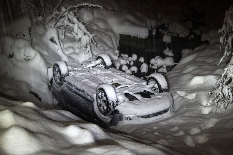 Kurz nach 17 Uhr kam ein Autolenker in einer Linkskurve zwischen Steinstoss und Wissenbach auf der schneebedeckten Strasse von der Fahrbahn ab. Das Auto kippte über die linke Fahrzeugseite weg und kam im Bachbett, auf dem Dach liegend, zum Stillstand.