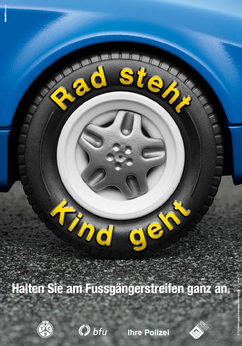 - Halten Sie vor dem Fussgängerstreifen vollständig an und geben Sie keine Handzeichen. Vermeiden Sie es, langsam rollend auf den Fussgängerstreifen zuzufahren. Die Kinder lernen erst über die Strasse zu gehen, wenn das Fahrzeug stillsteht.