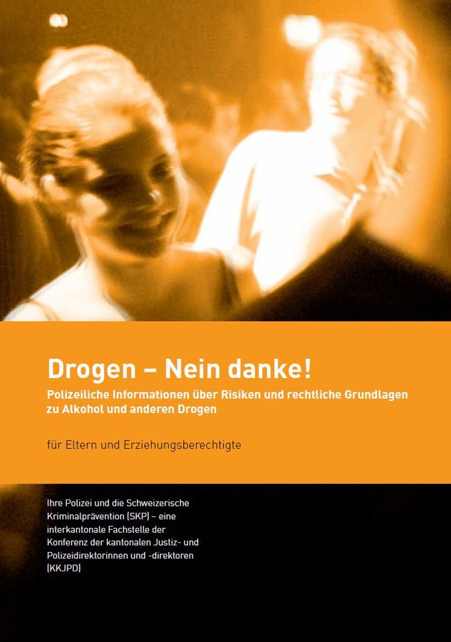 Hier finden Sie die neue Broschüre "Drogen - Nein Danke!". Die Schweizerische Kriminalprävention (SKP) hat diese Broschüre in Zusammenarbeit mit Vertreterinnen und Vertretern der kantonalen Polizeikorps und Drogenfachstellen zum Thema Alkohol und andere Drogen erarbeitet.