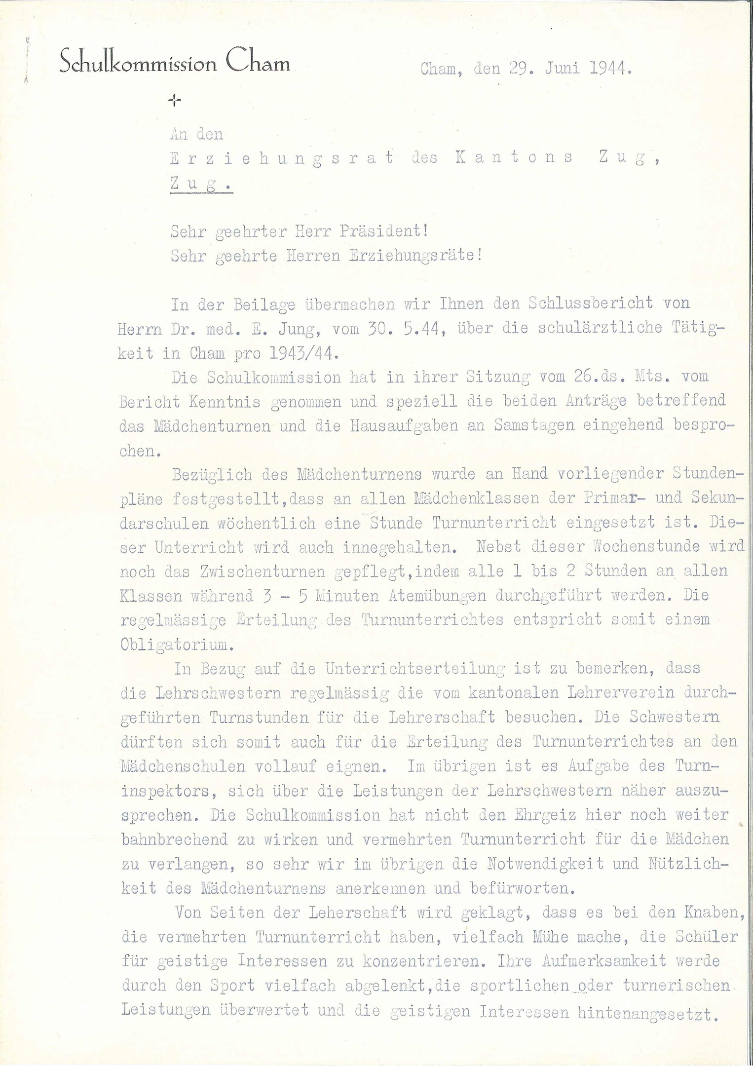 1943 war das Mädchenturnen im Kanton Zug noch nicht obligatorisch. Es kam dann die Frage auf, ob und inwiefern das Mädchenturnen ausgebaut werden soll und ob es nützlich oder schädlich sei.