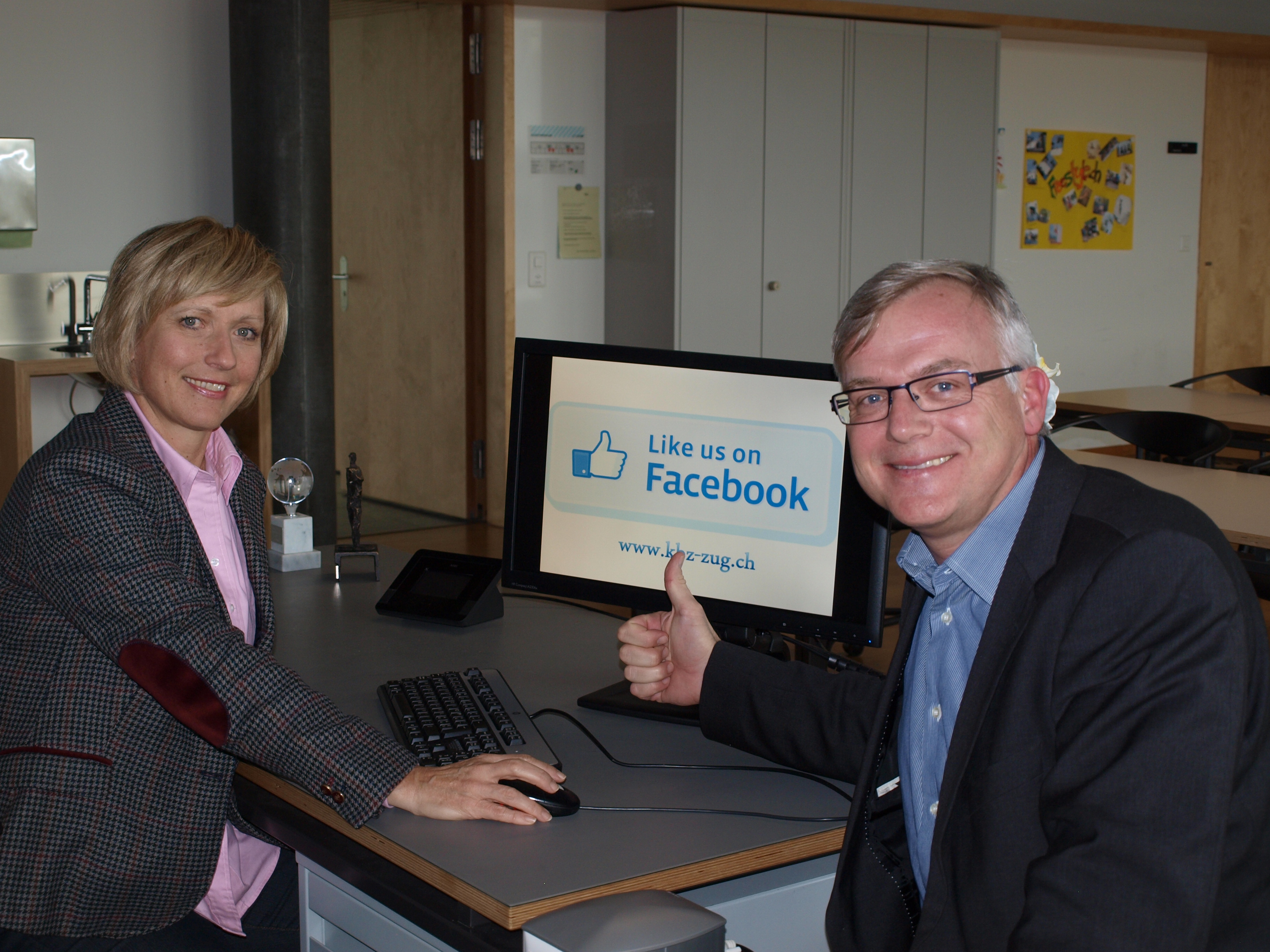 Doris Dörig (Auszeichnung Marketing Award) eröffnet mit Rektor Hansjörg Truttmann den Facebook Auftritt des Kaufmännischen Bildungszentrums Zug (zur Verfügung gestellt)