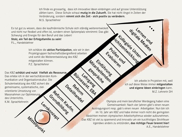 Neben der notwendigen Entwicklung gemäss neuen Vorgaben und Rahmenbedingungen entwickelt die Schulleitung in Partnerschaft mit den Lehrpersonen und Lernenden die Schule und insbesondere das Lernen am KBZ Schritt für Schritt näher an unsere Vision!