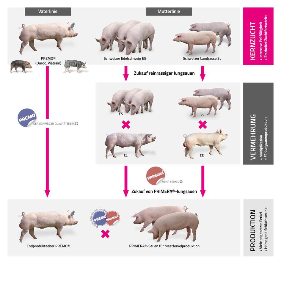Die Schweizer Edelschweine stammen von alten Landschlägen ab und wurden bereits in der ersten Hälfte des 20. Jahrhundert mit der englischen Yorkshire-Rasse veredelt. Im Jahr 2002 wurde die Edelschwein Zuchtpopulation in zwei Rassen aufgeteilt. Tiere mit ausgezeichneten Mast- und Schlachtleistungseigenschaften wurden der neuen Rasse ESV (Premo) zugeordnet. Auf dem Betrieb Waldegg und bei sieben weiteren Kernzüchtern werden die Premo-Eber als Endstufeneber auf Mast- und Schlachtleistungen mit besonderem Fokus auf die Fleischqualitätsmerkmale gezüchtet. Nur Eber mit einem Gesamtzuchtwert über 100 bei der Eigenleistungsprüfung erhalten die Premo-Ohrmarke.