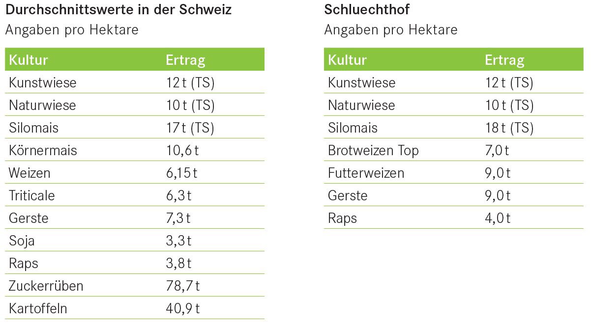Die Flächenerträge können je nach Region auch im Talgebiet stark abweichen. Die Niederschlagsmenge hat den grössten Einfluss auf den Ertrag, so gibt es markante Unterschiede zwischen der Westschweiz und der Zentralschweiz bei der Kunstwiese. Die Erträge am Schluechthof lagen in den letzten Jahren im Ertragsdurchschnitt der Schweiz.