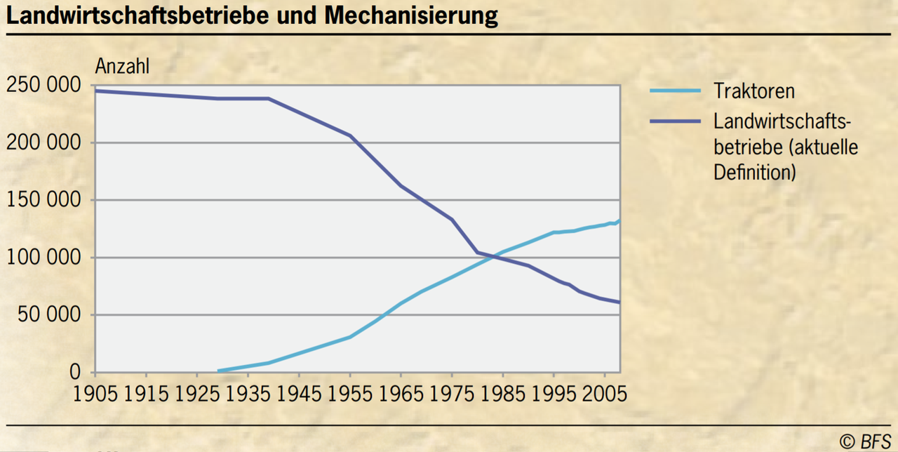 In den letzten 100 Jahren hat in der Schweizer Landwirtschaft ein extremer Strukturwandel stattgefunden. So hat die Zahl der Betriebe stark abgenommen, im Gegenzug mussten immer weniger Menschen immer mehr Landwirtschaftsfläche bewirtschaften. Dies konnte nur mit Hilfe von Traktoren und Maschinen geschehen.