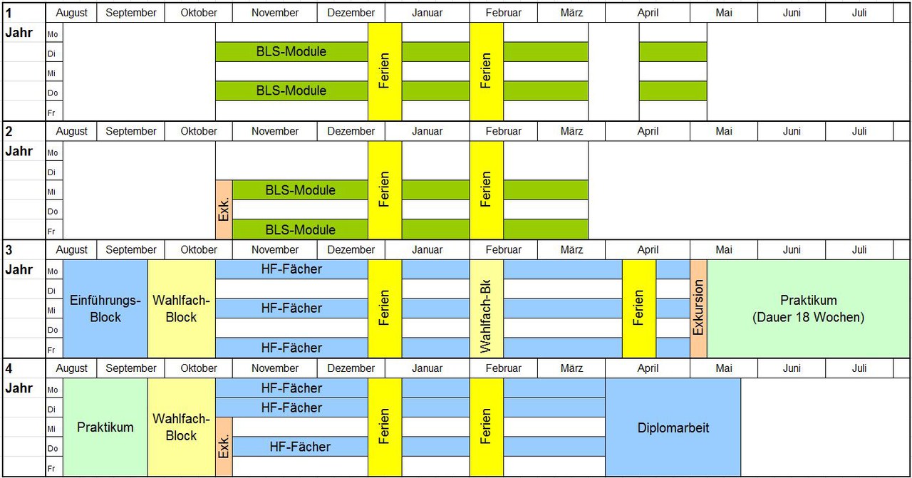 Die Vollzeitausbildung erstreckt sich über knapp 2 Jahre. Zu Beginn werden in einem Block allgemeinbildende Fächer sowie gesellschaftliche & naturwissenschaftliche Zusammenhänge ausgebildet. Anschließend folgt ein 3 - 4 Wochen dauernder Wahlfachblock. Während der Zeit von Oktober bis März folgen im ersten Winter die obligatorischen Module aus der Betriebsleiterschule 1. Ergänzend dazu kommen die Fächer der Höheren Fachschule. Nach einem weiteren kurzen Schulblock im April/Mai folgen eine wöchige Auslandreise und das Praktikum. Nach dem Praktikum geht es in den zweiten Winter, welcher aus den Fächern der Betriebsleiterschule II und den ergänzenden HF-Fächern besteht. Der Abschluss bildet die Diplomarbeit. Dafür sind 8 Wochen vorgesehen.