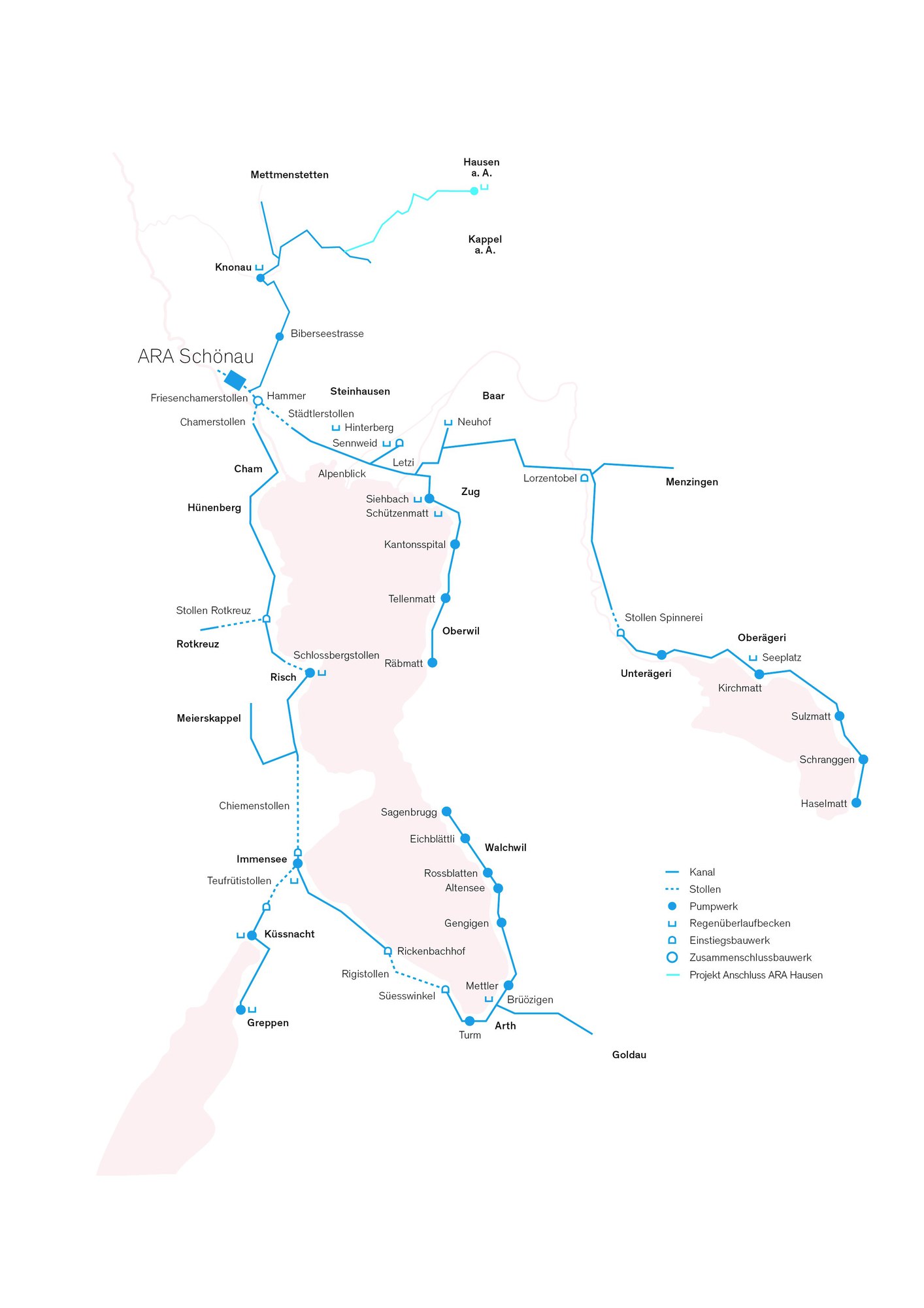 Das Kanalnetz ist in drei Hauptstränge geteilt. Abwasser von rund 35 % der Einwohner wird über den Kanalstrang von Walchwil über Immensee nach Cham geleitet, die anderen rund 60 % gelangen über die Hauptleitung vom Ägerital und von Zug nach Cham und rund 5 % aus dem Knonaueramt. Das Abwasser aus Walchwil braucht rund 5,5 Stunden bis es in der ARA Schönau ankommt, jenes von Oberägeri rund 5 Stunden. Bei starken Regenfällen und grossem Wasseranfall im Kanalisationssystem kann in den Regenüberlaufbecken Abwasser zurückgehalten werden. Nach den Regenereignissen wird dieses gestaute Schmutzwasser in die ARA Schönau abgeleitet und mit dem übrigen Abwasser gereinigt.